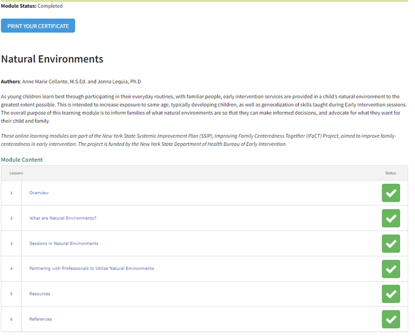 Once you complete a module, there will be an option to “Print Your Certificate” that will appear at the upper left-hand corner of the module page, under the “Module Status”: